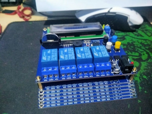 PCB double layer berbasis ATmega328P yang digunakan sebagai sistem kontrol 4 channel relay dengan tampilan LCD 16x2 dan beberapa tombol input. Board ini dibuat untuk kebutuhan otomasi sederhana dengan fitur pengaturan waktu langsung dari perangkat. Pada projek ini juga dilakukan perancangan skematik, routing PCB, serta integrasi LCD dan driver relay dalam satu board.